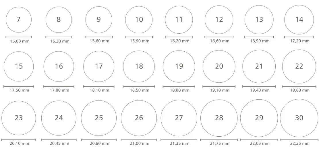 - Standardowe rozmiary obrączek w Europie mieszczą się w zakresie od 58 do 67.